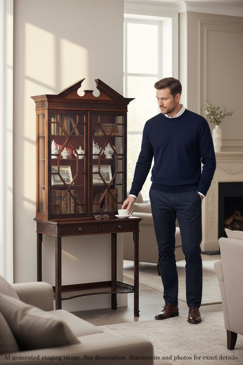 Full of authentic charm and character, this distinguished 19th Century antique mahogany pier display cabinet was crafted by the renowned London makers, Edwards & Roberts. A rare and impressive find, it features intricate Chinoiserie blind fret-cut decoration and an elegant split-arch pediment, which enhances the piece's aesthetic appeal.