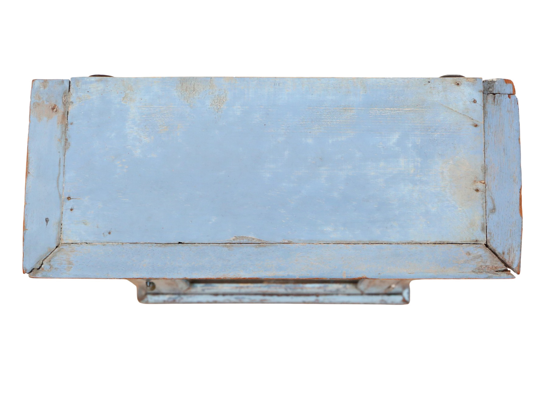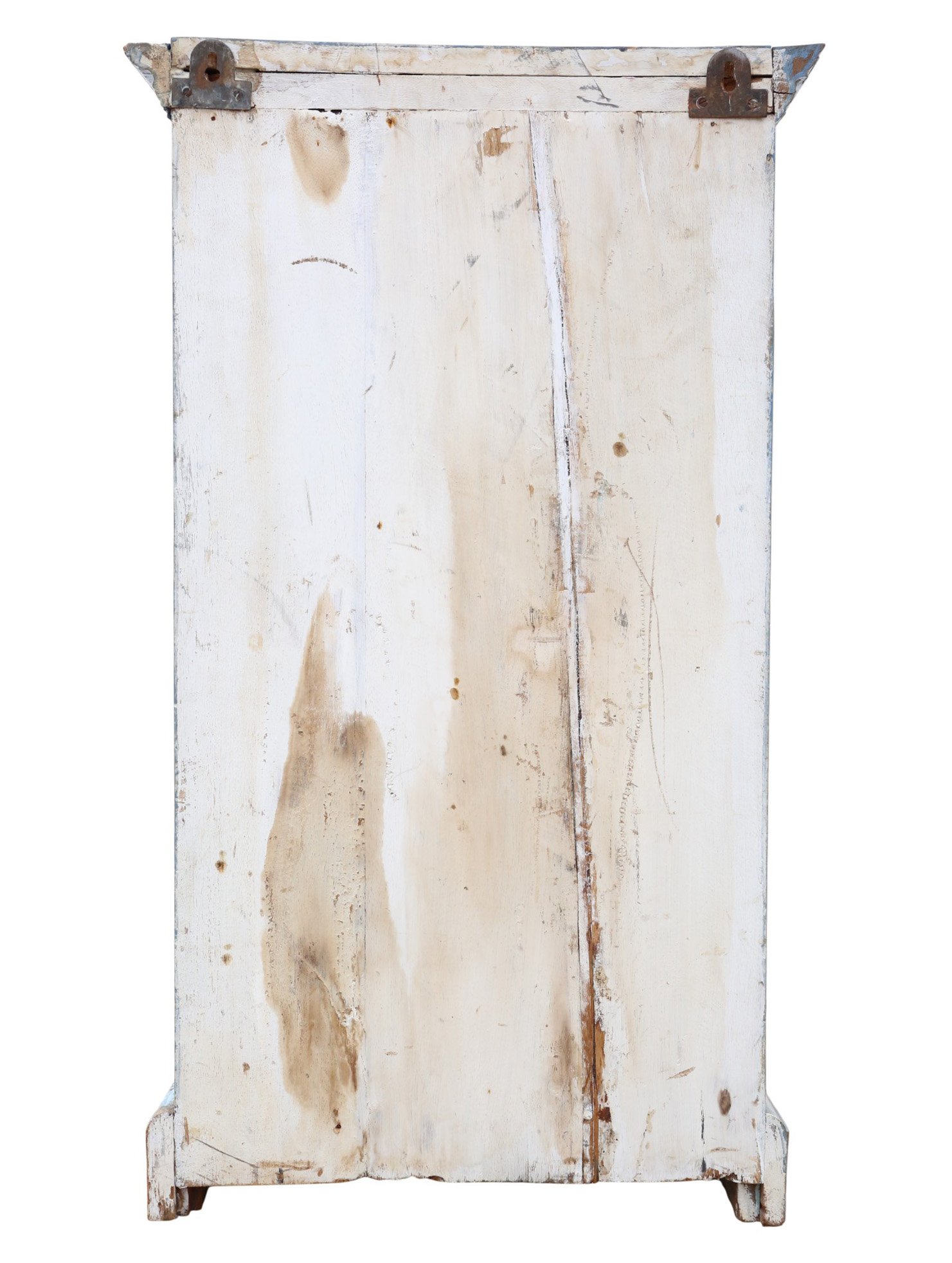 Full of authentic charm and character, this rare antique cabinet cupboard would complement a period, contemporary, or country-inspired interior wonderfully. Designed to be hung on the wall, it features two shelves inside and practical hangers on the back for easy installation. Distressed blue paint contributes to its rustic finish; the inside of the cabinet can be repainted if desired.