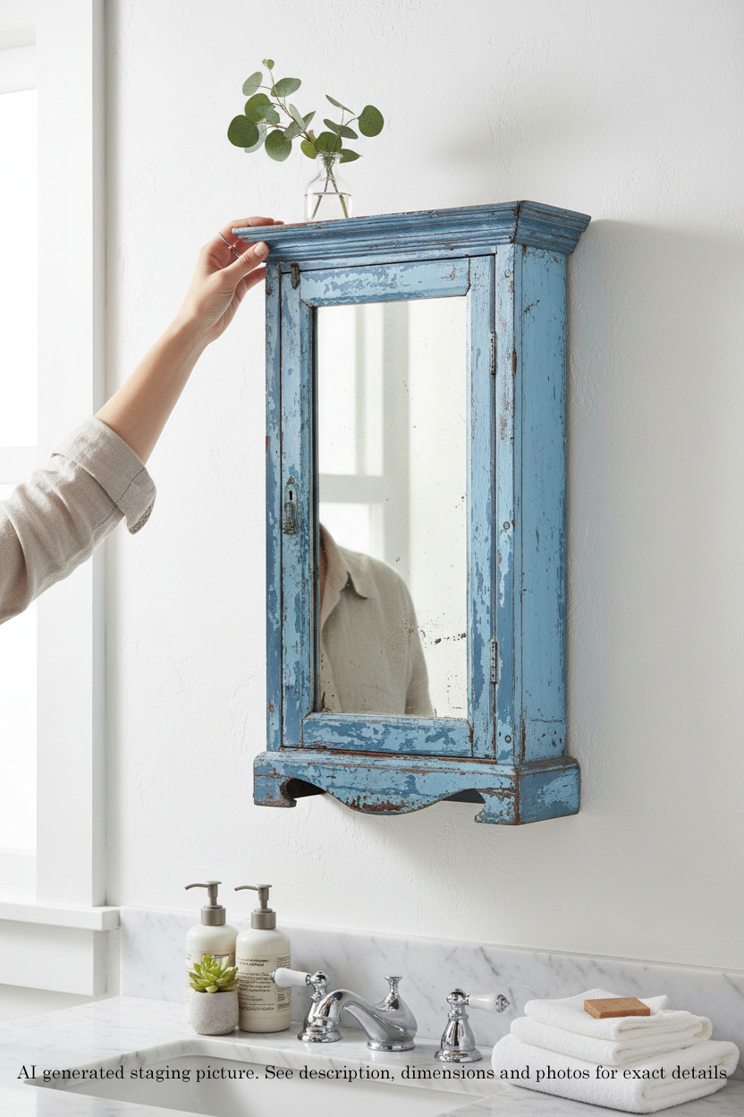 Antique c.1900 Distressed Blue Painted Cabinet with Mirror – Early 20th Century Cupboard / Shelving