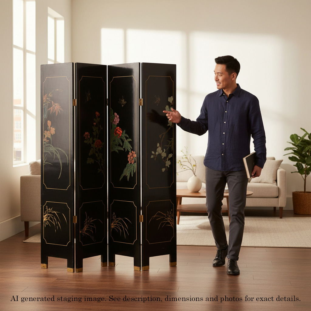Antique c.1900 Large Victorian Chinoiserie Black Lacquer Papier Mâché Dressing Screen - Fine Quality Room Divider