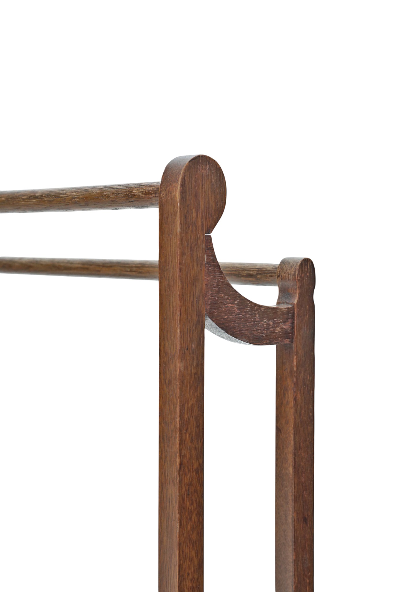 An antique c.1900 oak towel rail stand full of age, character, and patina, featuring simple, clean lines and traditional craftsmanship. This rare Arts & Crafts piece is structurally sound and practical for everyday use, while also serving as a decorative statement piece, ideal for a bedroom, bathroom, or dressing area.
