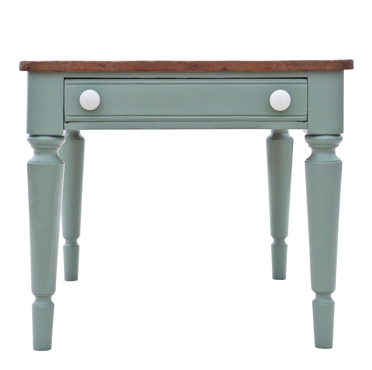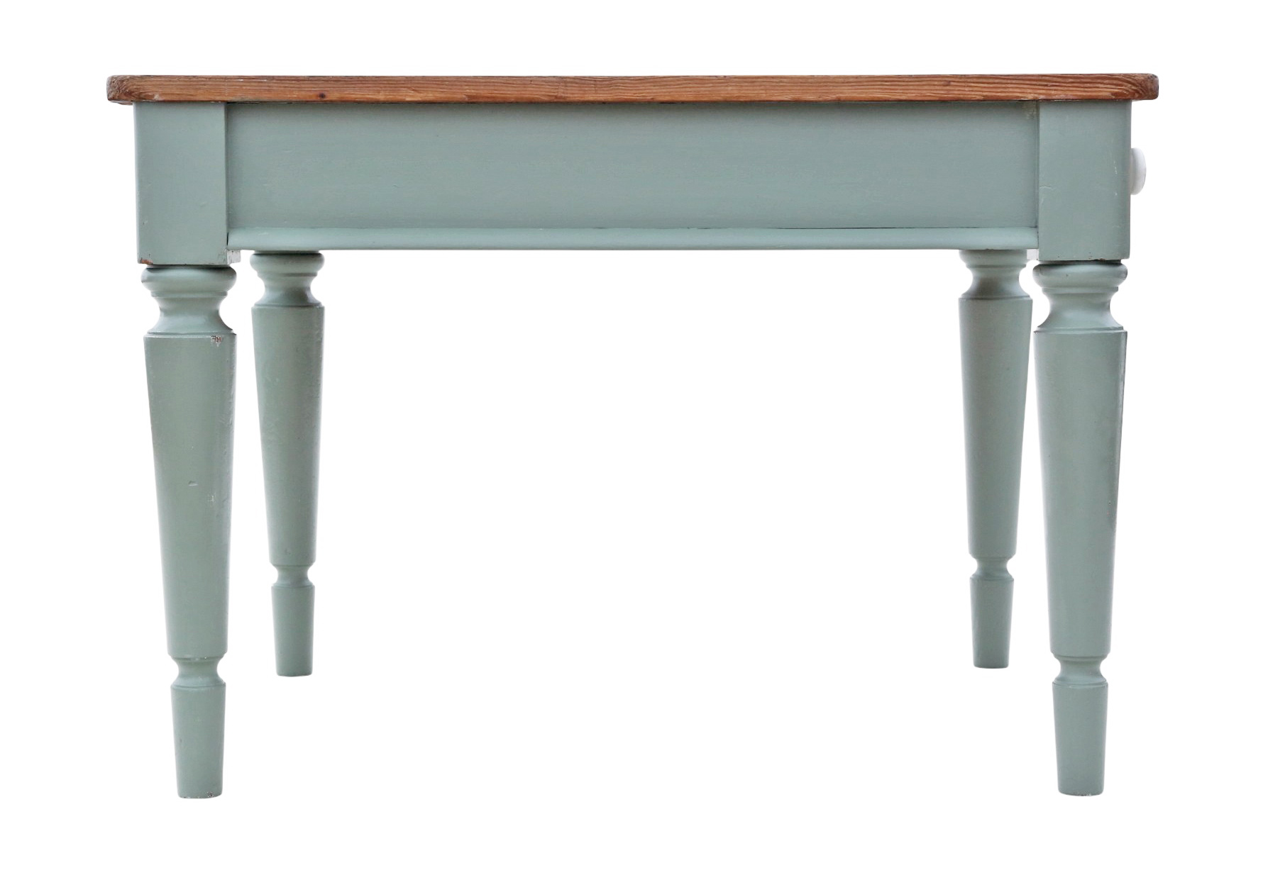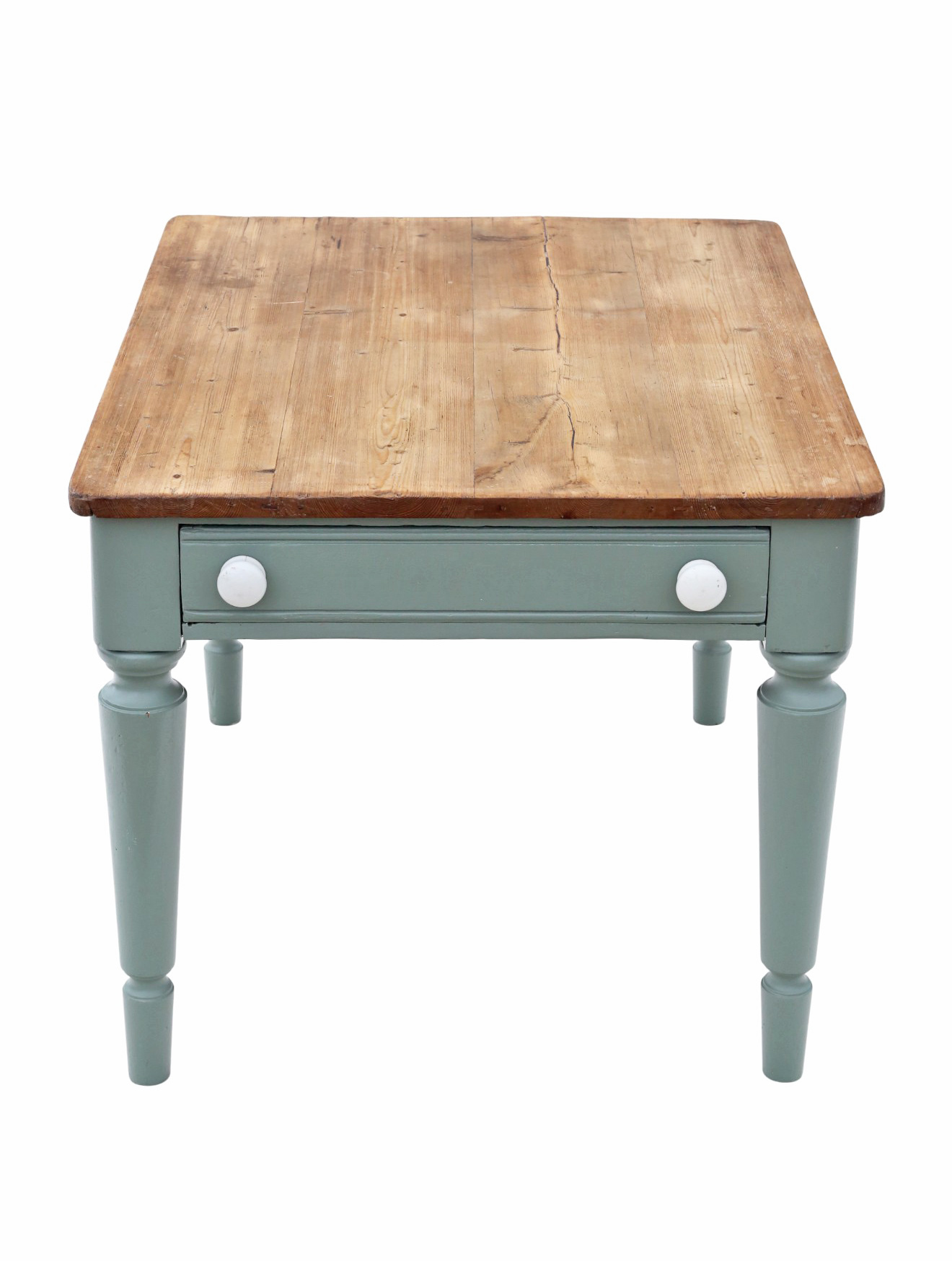 In very good antique condition, showing historic knocks, marks, cracks, imperfections, repairs, and alterations consistent with functional period furniture. Recently refinished in pale green/blue paint. Some historic extinct woodworm holes have been treated. End drawer slides freely.