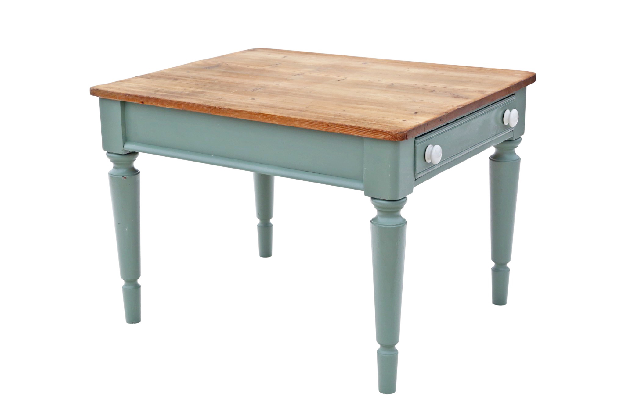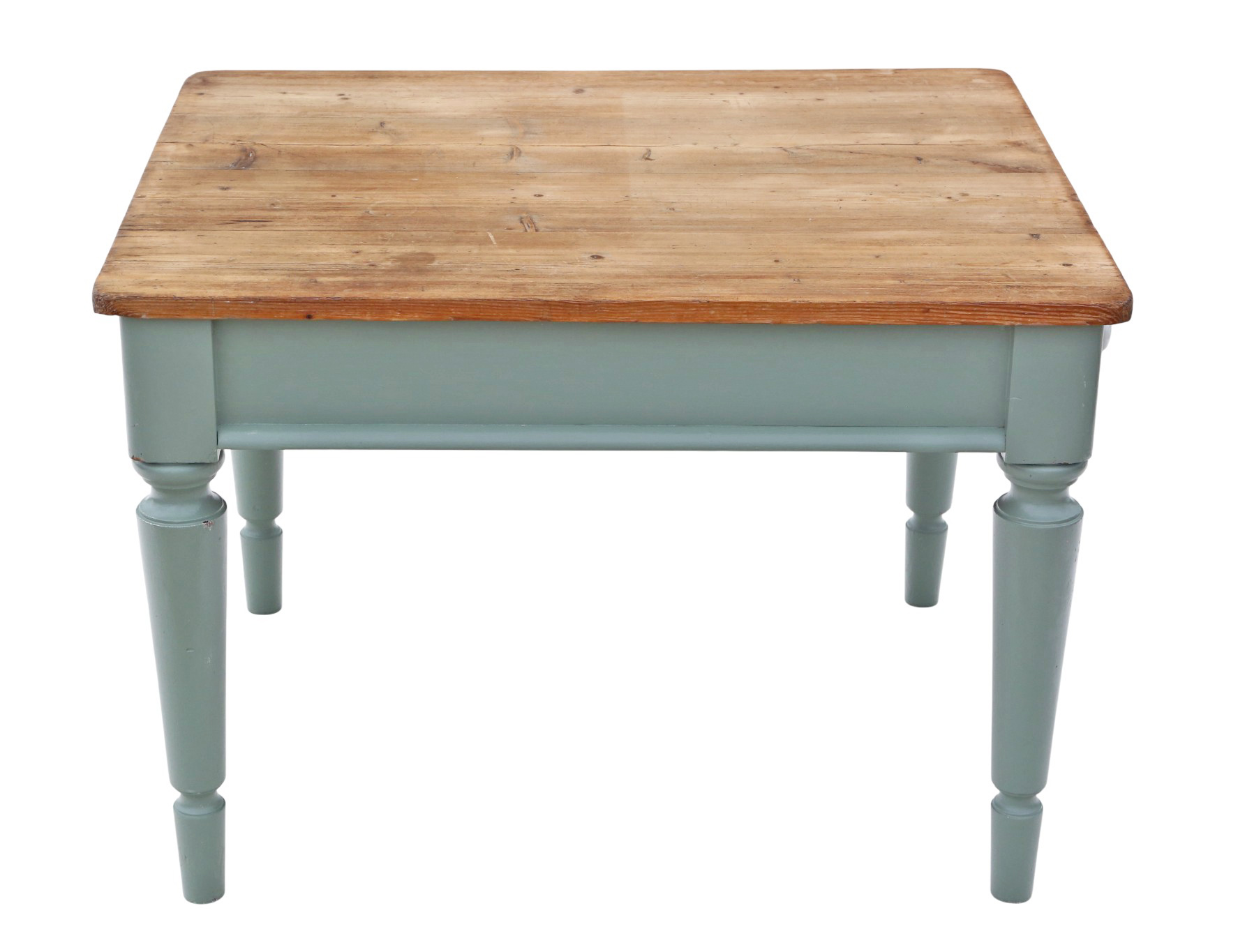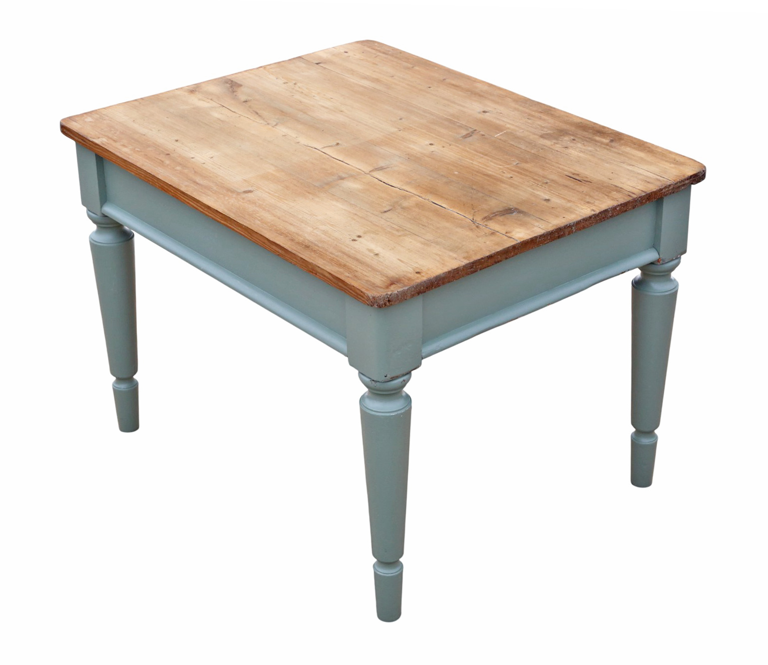 In very good antique condition, showing historic knocks, marks, cracks, imperfections, repairs, and alterations consistent with functional period furniture. Recently refinished in pale green/blue paint. Some historic extinct woodworm holes have been treated. End drawer slides freely.